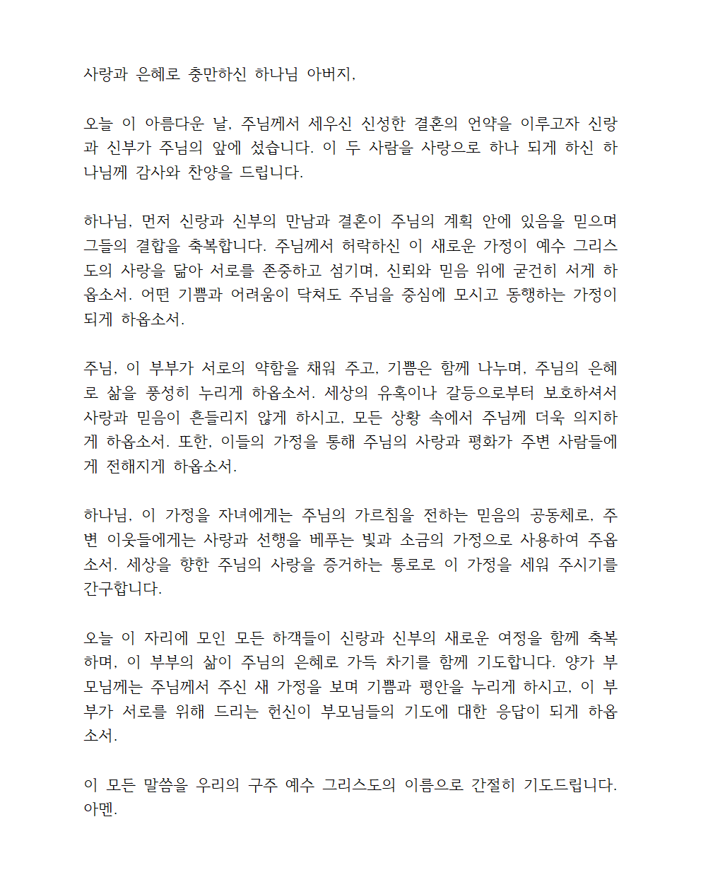 결혼식에서 직접 사용할 수 있도록 기도문을 첨부파일(한글문서, PDF 문서)로도 올려드릴 테니 상황에 맞게 수정하여 쓰시면 좋겠습니다.