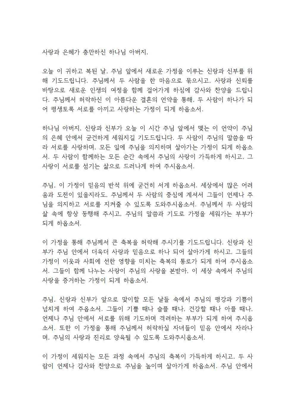 결혼식에서 직접 적용하실 수 있도록 기도문을 첨부파일(한글문서, PDF 문서)도 올려드릴 테니 상황에 맞게 수정하여 쓰시면 좋겠습니다.