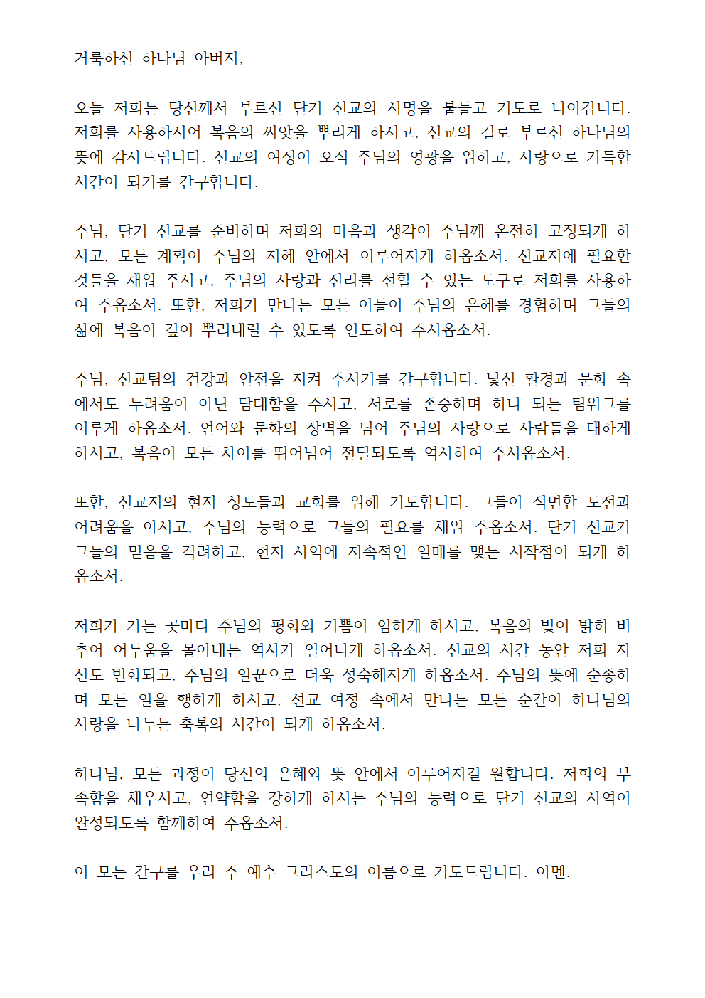이 기도문은 단기 선교를 통해 하나님의 복음이 전파되고, 선교팀과 선교지가 주님의 은혜 안에서 하나 되길 간구하는 내용입니다.
