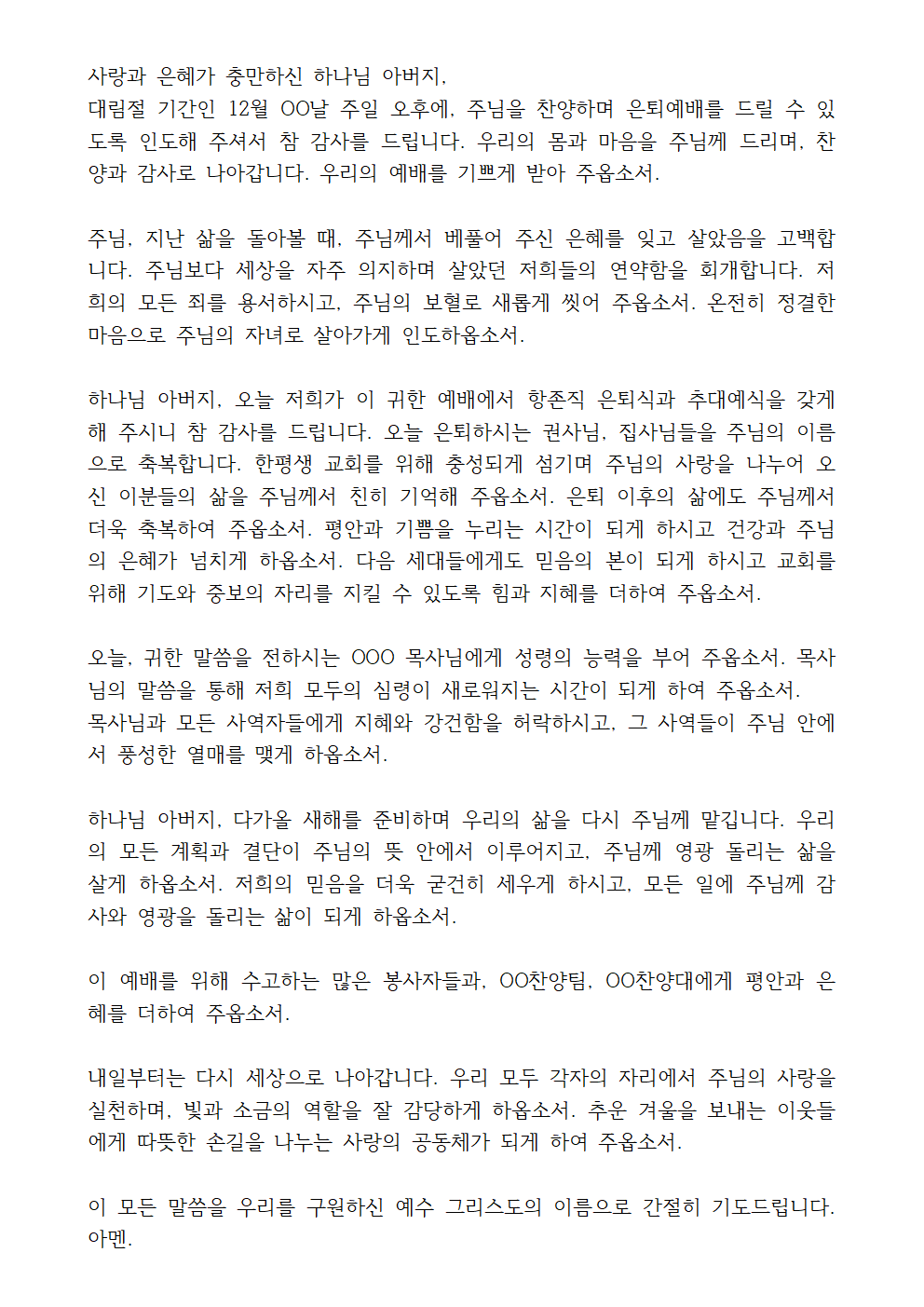 대림절 기간인 12월 OO날 주일 오후에, 주님을 찬양하며 은퇴예배를 드릴 수 있도록 인도해 주셔서 참 감사를 드립니다. 우리의 몸과 마음을 주님께 드리며, 찬양과 감사로 나아갑니다. 우리의 예배를 기쁘게 받아 주옵소서.