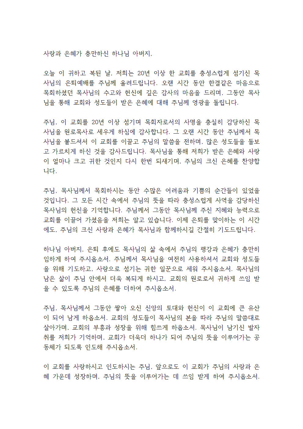 이 기도문에는 20년 이상 한 교회에서 충성스럽게 시무하시고 원로목사로 추대되시는 목사님의 은퇴식을 포함하고 있습니다.