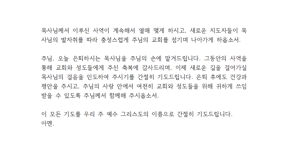 또한, 목사님의 은퇴 후에도 하나님의 은혜와 평강이 함께하길 기도하며, 앞으로의 삶에서도 교회와 성도들을 위해 귀하게 쓰임받으시길 간구합니다.