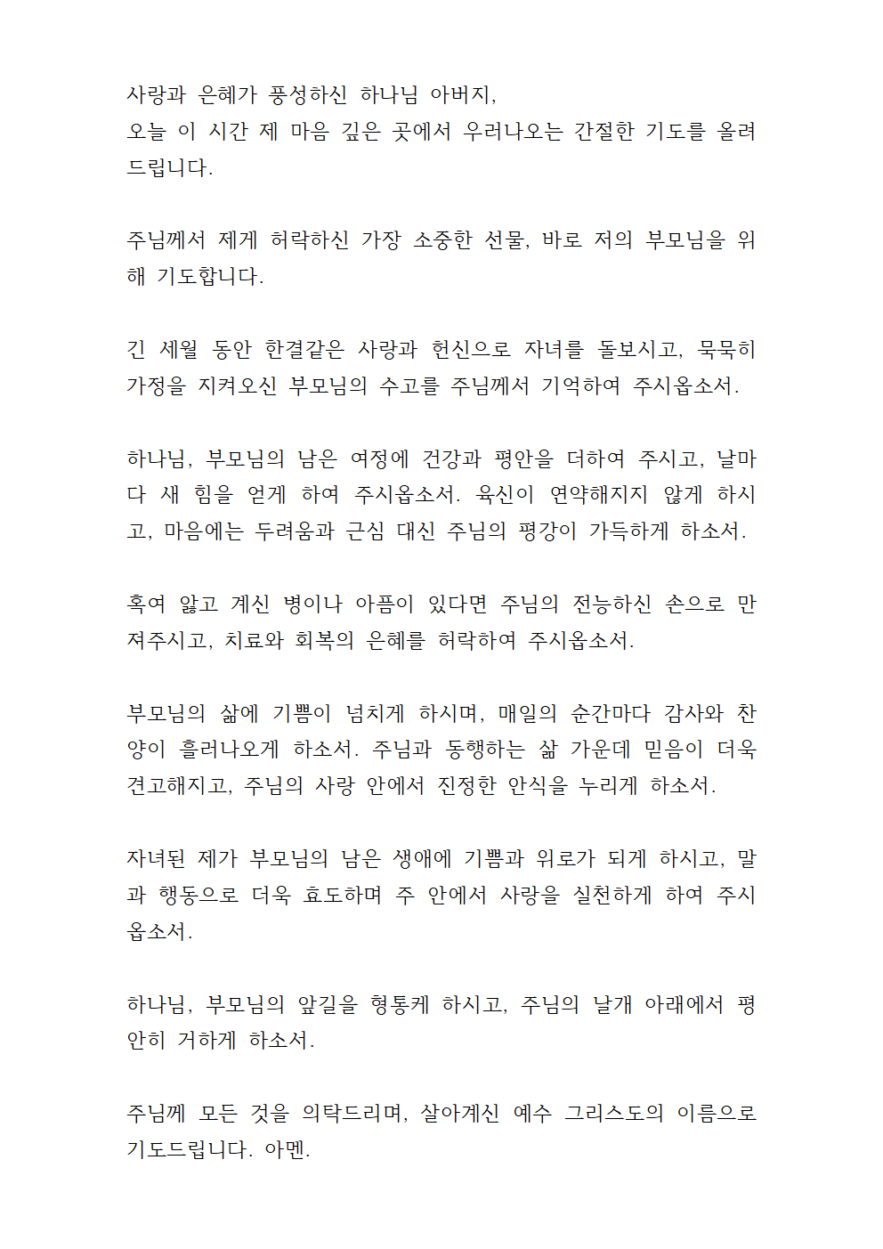자녀된 제가 부모님의 남은 생애에 기쁨과 위로가 되게 하시고, 말과 행동으로 더욱 효도하며 주 안에서 사랑을 실천하게 하여 주시옵소서.