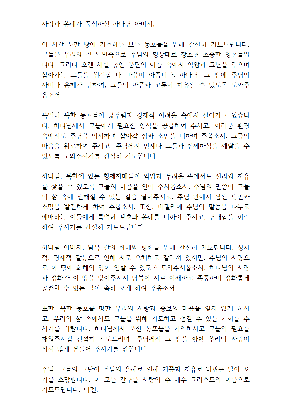 이번 기도문에서는 북한 동포들이 어려운 상황 속에서도 하나님의 보호와 위로를 받으며, 남북이 화해와 평화 속에서 하나님의 사랑 안에 거하기를 기도합니다.