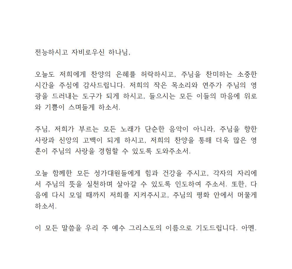 오늘 함께한 모든 성가대원들에게 힘과 건강을 주시고, 각자의 자리에서 주님의 뜻을 실천하며 살아갈 수 있도록 인도하여 주소서. 또한, 다음에 다시 모일 때까지 저희를 지켜주시고, 주님의 평화 안에서 머물게 하소서.