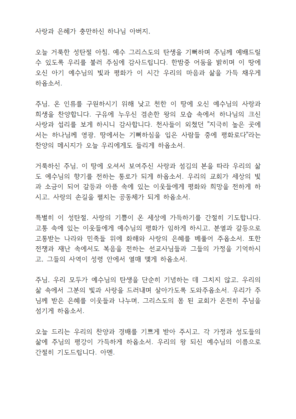 주님, 우리 모두가 예수님의 탄생을 단순히 기념하는 데 그치지 않고, 우리의 삶 속에서 그분의 빛과 사랑을 드러내며 살아가도록 도와주옵소서. 우리가 주님께 받은 은혜를 이웃들과 나누며, 그리스도의 몸 된 교회가 온전히 주님을 섬기게 하옵소서.