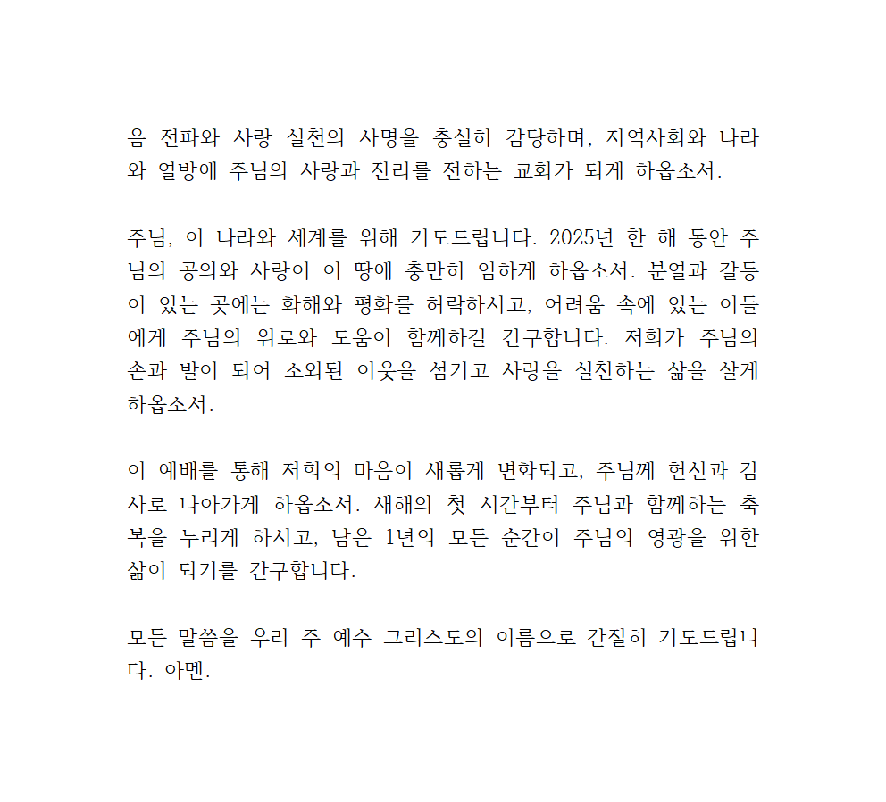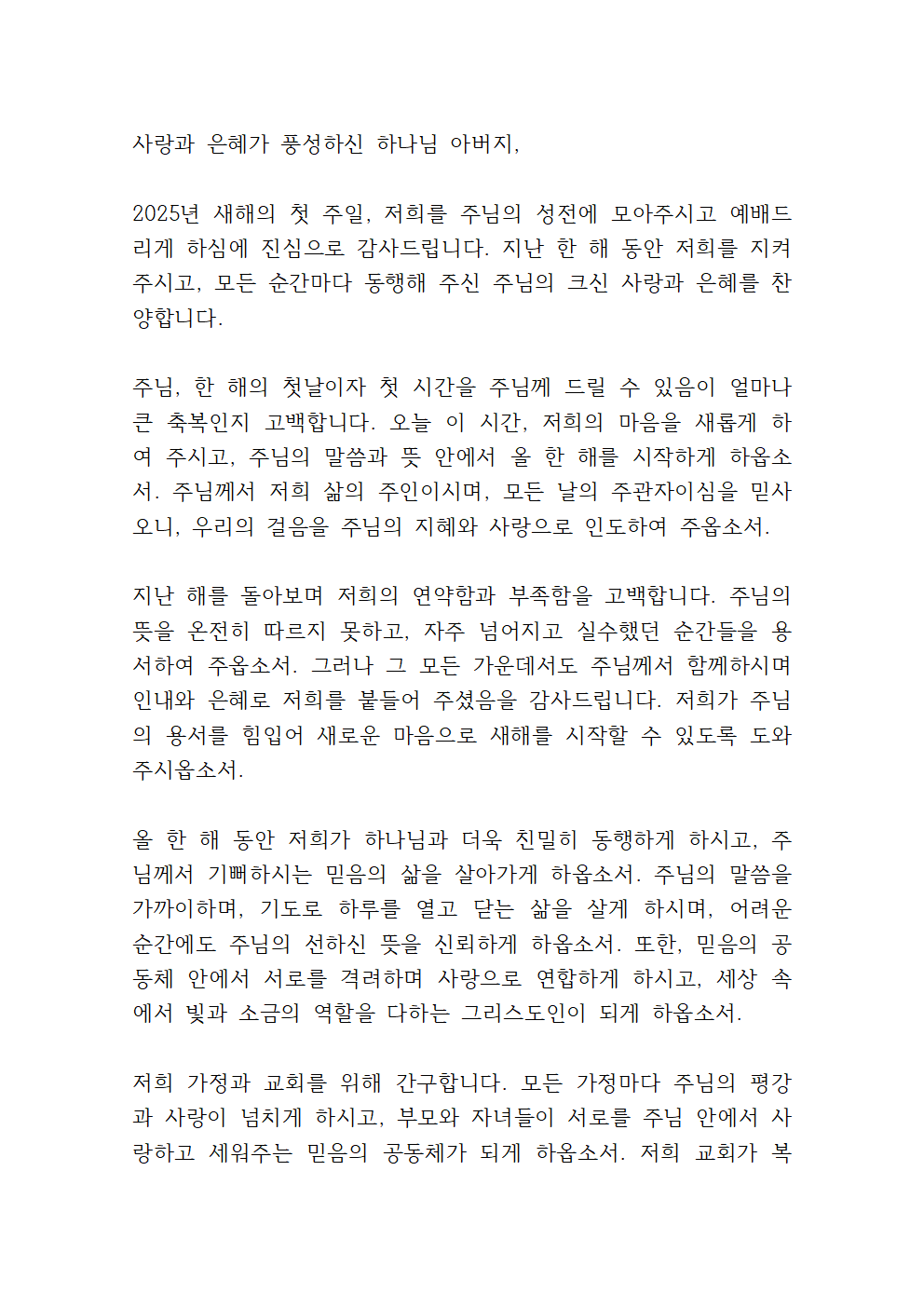 따라서 이번 기도문은 개인과 공동체가 새롭게 결단하며 하나님께 영광을 돌리고, 새로운 한 해를 믿음으로 살아가겠다는 다짐을 담고 있습니다.