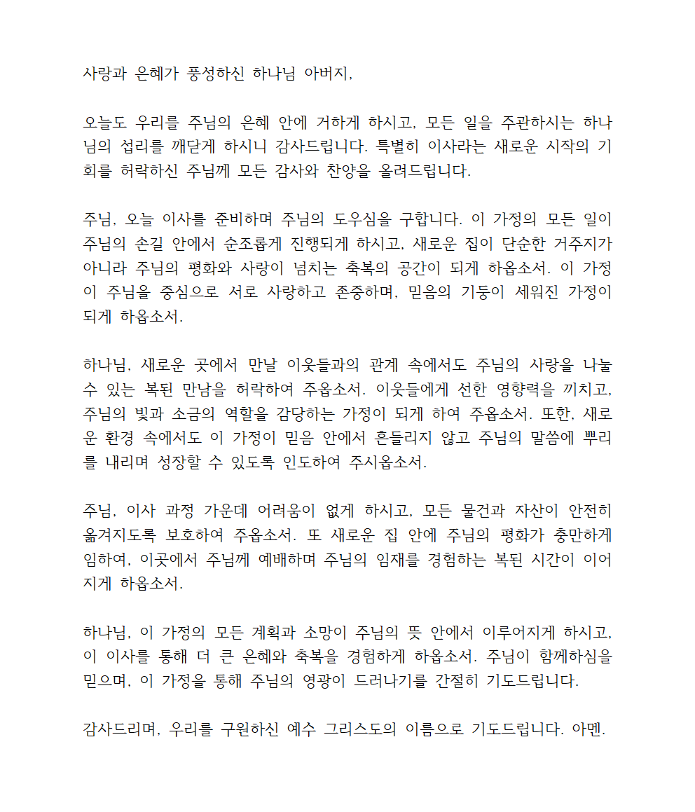 이번 기도문은 이사를 준비하는 가정을 위해 하나님의 인도하심과 보호를 간구하며, 새로운 집이 하나님의 평화와 사랑으로 가득 차는 축복의 공간이 되기를 기도하고 있습니다.