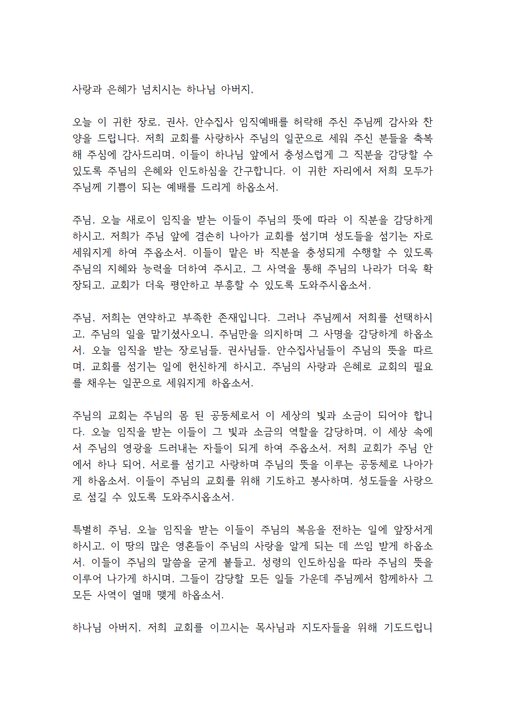 주님, 오늘 새로이 임직을 받는 이들이 주님의 뜻에 따라 이 직분을 감당하게 하시고, 저희가 주님 앞에 겸손히 나아가 교회를 섬기며 성도들을 섬기는 자로 세워지게 하여 주옵소서. 이들이 맡은 바 직분을 충성되게 수행할 수 있도록 주님의 지혜와 능력을 더하여 주시고, 그 사역을 통해 주님의 나라가 더욱 확장되고, 교회가 더욱 평안하고 부흥할 수 있도록 도와주시옵소서.
