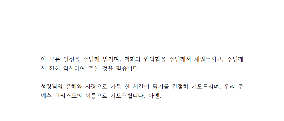 이 모든 일정을 주님께 맡기며, 저희의 연약함을 주님께서 채워주시고, 주님께서 친히 역사하여 주실 것을 믿습니다. 성령님의 은혜와 사랑으로 가득 찬 시간이 되기를 간절히 기도드리며, 우리 주 예수 그리스도의 이름으로 기도드립니다. 아멘.