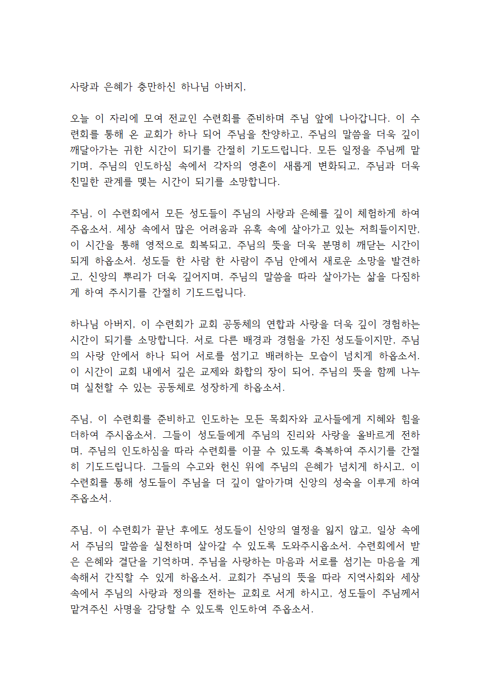 주님, 이 수련회에서 모든 성도들이 주님의 사랑과 은혜를 깊이 체험하게 하여 주옵소서. 세상 속에서 많은 어려움과 유혹 속에 살아가고 있는 저희들이지만, 이 시간을 통해 영적으로 회복되고, 주님의 뜻을 더욱 분명히 깨닫는 시간이 되게 하옵소서. 성도들 한 사람 한 사람이 주님 안에서 새로운 소망을 발견하고, 신앙의 뿌리가 더욱 깊어지며, 주님의 말씀을 따라 살아가는 삶을 다짐하게 하여 주시기를 간절히 기도드립니다.