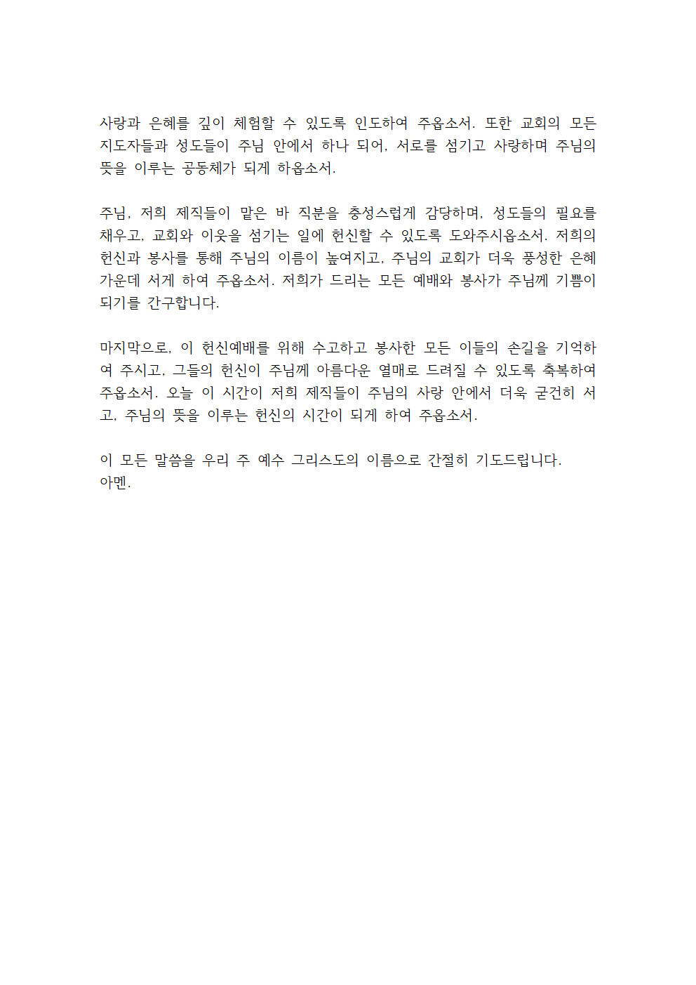 마지막으로, 이 헌신예배를 위해 수고하고 봉사한 모든 이들의 손길을 기억하여 주시고, 그들의 헌신이 주님께 아름다운 열매로 드려질 수 있도록 축복하여 주옵소서. 오늘 이 시간이 저희 제직들이 주님의 사랑 안에서 더욱 굳건히 서고, 주님의 뜻을 이루는 헌신의 시간이 되게 하여 주옵소서.