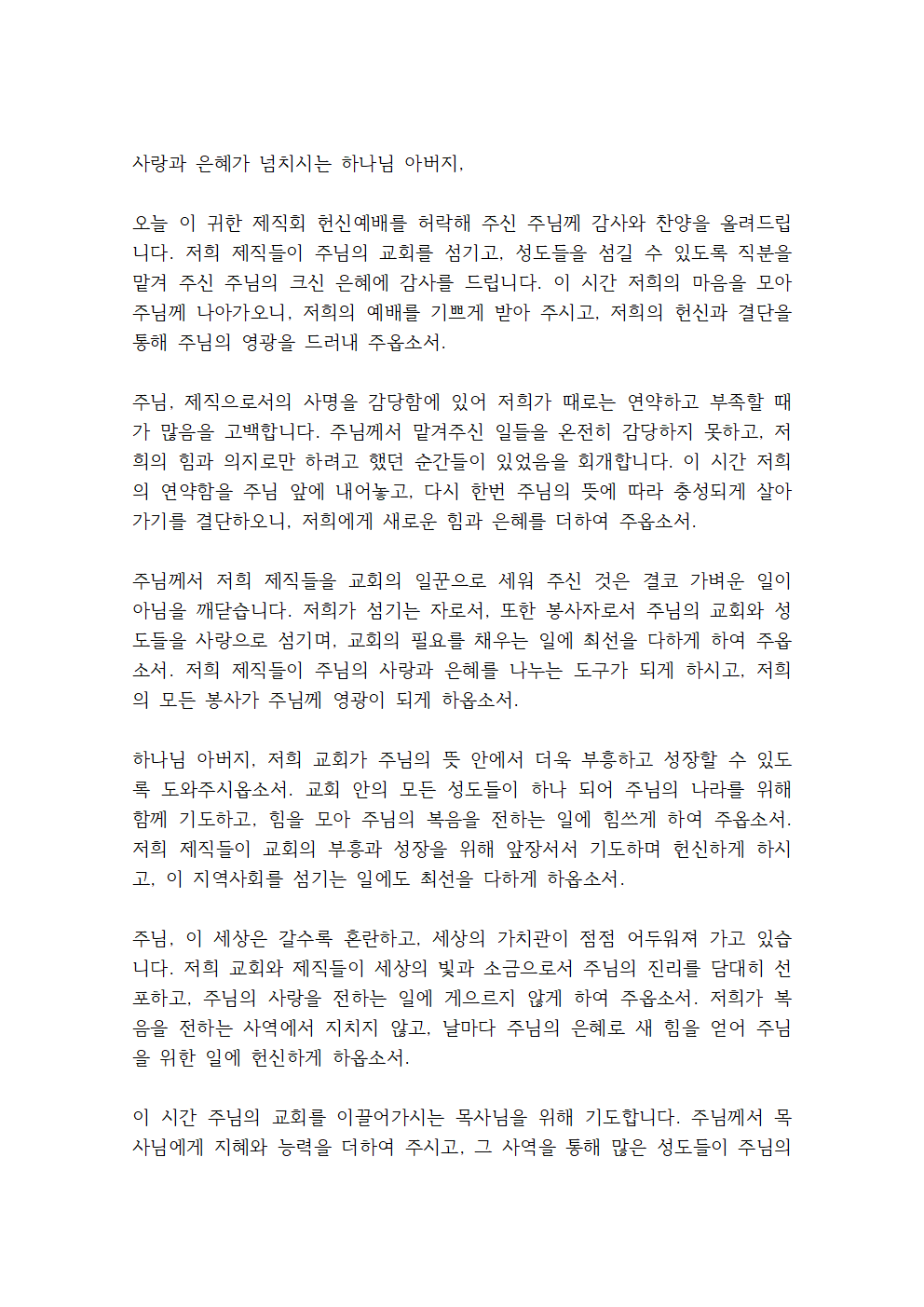 주님께서 저희 제직들을 교회의 일꾼으로 세워 주신 것은 결코 가벼운 일이 아님을 깨닫습니다. 저희가 섬기는 자로서, 또한 봉사자로서 주님의 교회와 성도들을 사랑으로 섬기며, 교회의 필요를 채우는 일에 최선을 다하게 하여 주옵소서. 저희 제직들이 주님의 사랑과 은혜를 나누는 도구가 되게 하시고, 저희의 모든 봉사가 주님께 영광이 되게 하옵소서.