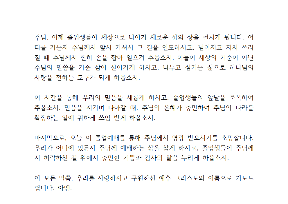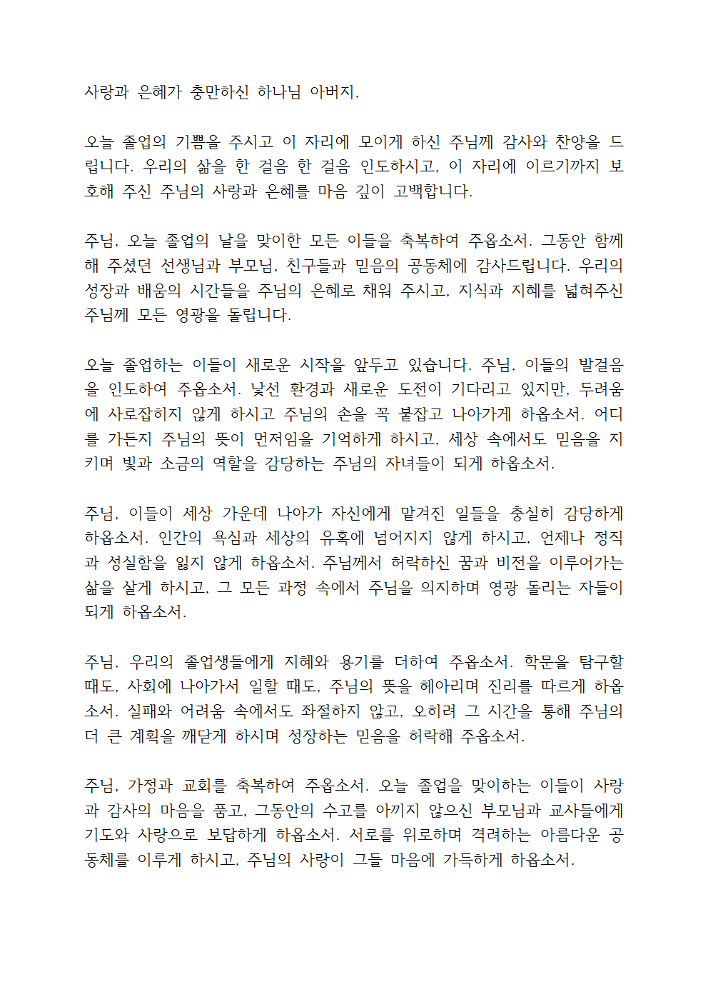 오늘 졸업의 기쁨을 주시고 이 자리에 모이게 하신 주님께 감사와 찬양을 드립니다. 우리의 삶을 한 걸음 한 걸음 인도하시고, 이 자리에 이르기까지 보호해 주신 주님의 사랑과 은혜를 마음 깊이 고백합니다.