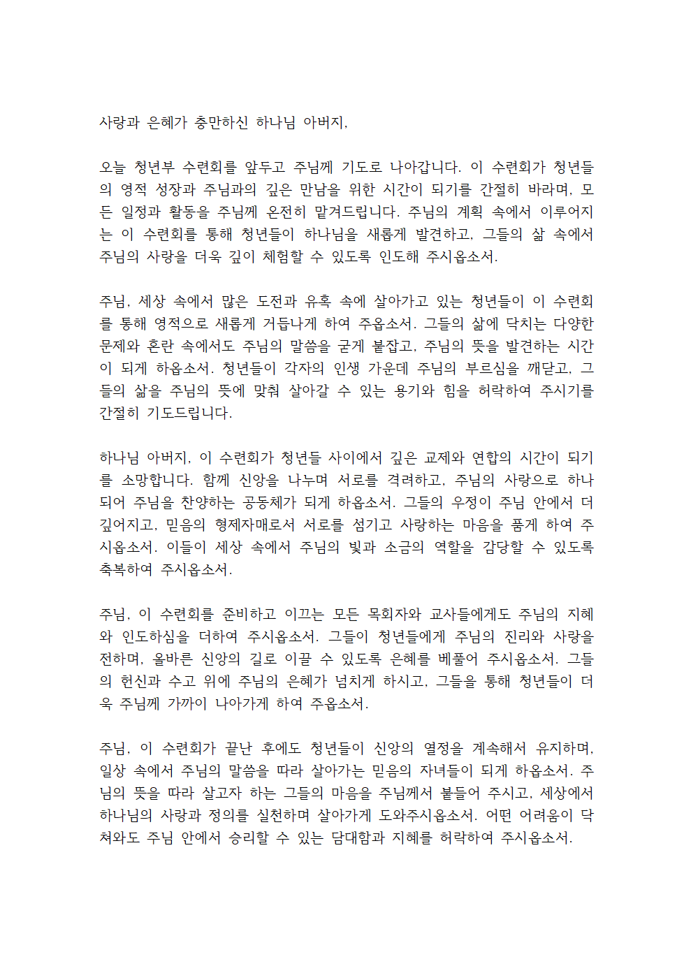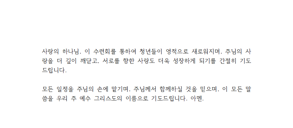 사랑의 하나님, 이 수련회를 통하여 청년들이 영적으로 새로워지며, 주님의 사랑을 더 깊이 깨닫고, 서로를 향한 사랑도 더욱 성장하게 되기를 간절히 기도드립니다. 모든 일정을 주님의 손에 맡기며, 주님께서 함께하실 것을 믿으며, 이 모든 말씀을 우리 주 예수 그리스도의 이름으로 기도드립니다. 아멘.