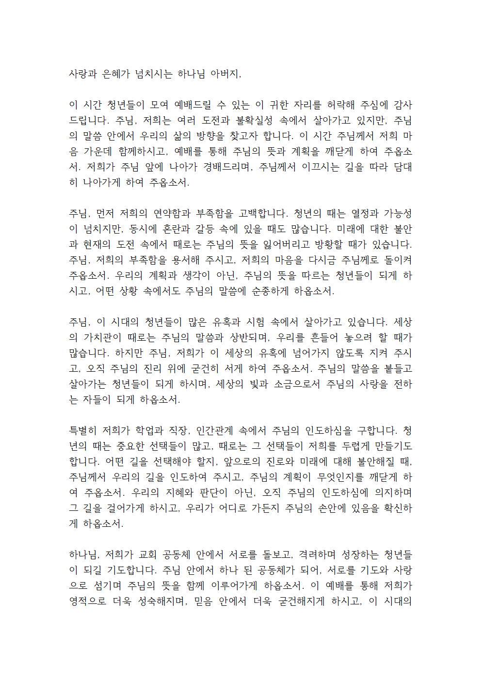 이 기도문은 청년들이 직면하는 여러 도전과 미래에 대한 불안감 속에서도 하나님을 신뢰하며, 그분의 뜻을 구하고 따르는 삶을 살아가기를 기도하는 내용을 담고 있습니다. 또한 청년들이 교회 공동체 안에서 서로 격려하며 주님의 사랑을 전하는 삶을 살아가도록 도와달라는 간구가 포함되어 있습니다.