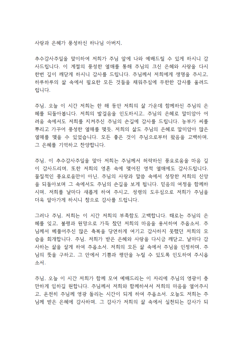 추수감사주일 예배에서 직접 적용하실 수 있도록 기도문을 첨부파일(한글문서, PDF 문서)도 올려드릴 테니 상황에 맞게 수정하여 쓰시면 좋겠습니다.