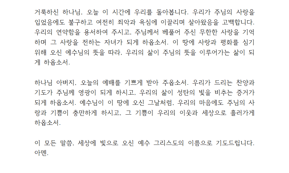 거룩하신 하나님, 오늘 이 시간에 우리를 돌아봅니다. 우리가 주님의 사랑을 입었음에도 불구하고 여전히 죄악과 욕심에 이끌리며 살아왔음을 고백합니다. 우리의 연약함을 용서하여 주시고, 주님께서 베풀어 주신 무한한 사랑을 기억하며 그 사랑을 전하는 자녀가 되게 하옵소서. 이 땅에 사랑과 평화를 심기 위해 오신 예수님의 뜻을 따라, 우리의 삶이 주님의 뜻을 이루어가는 삶이 되게 하옵소서.