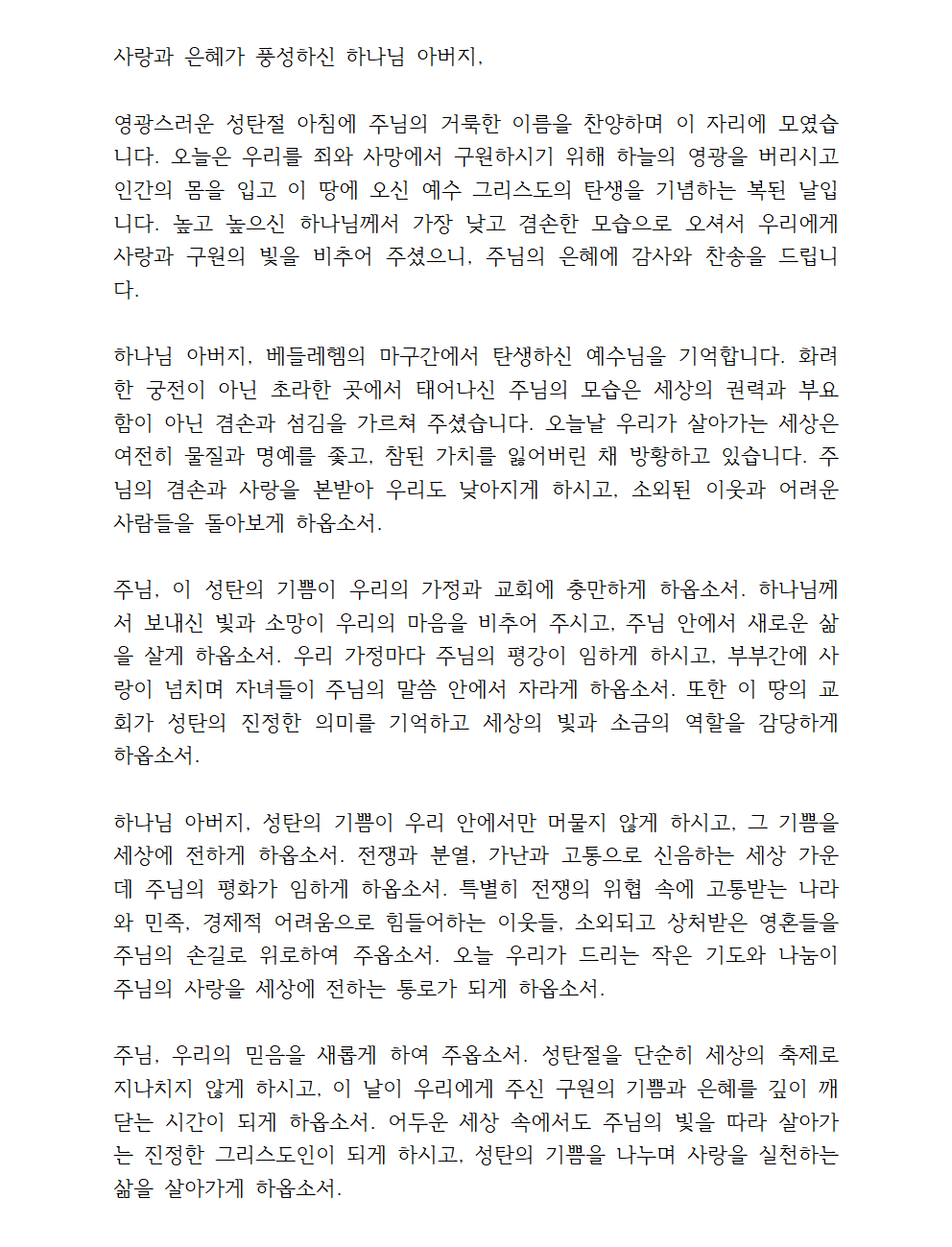 하나님 아버지, 성탄의 기쁨이 우리 안에서만 머물지 않게 하시고, 그 기쁨을 세상에 전하게 하옵소서. 전쟁과 분열, 가난과 고통으로 신음하는 세상 가운데 주님의 평화가 임하게 하옵소서. 특별히 전쟁의 위협 속에 고통받는 나라와 민족, 경제적 어려움으로 힘들어하는 이웃들, 소외되고 상처받은 영혼들을 주님의 손길로 위로하여 주옵소서. 오늘 우리가 드리는 작은 기도와 나눔이 주님의 사랑을 세상에 전하는 통로가 되게 하옵소서.
