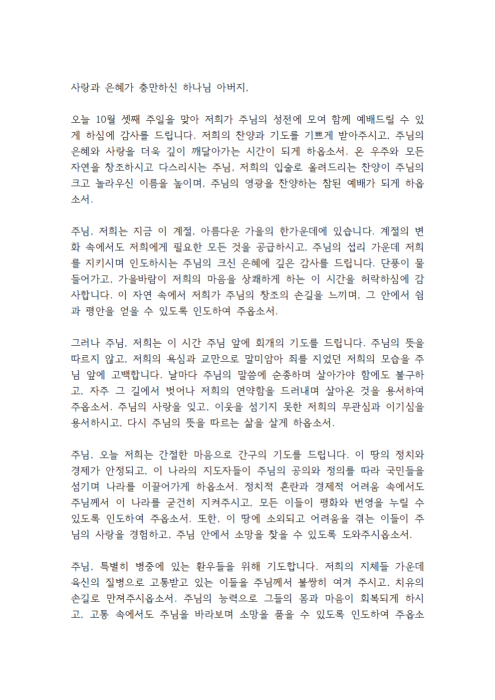 '10월 3째주일예배 대표기도문 (셋째주 주일낮 예배)'
