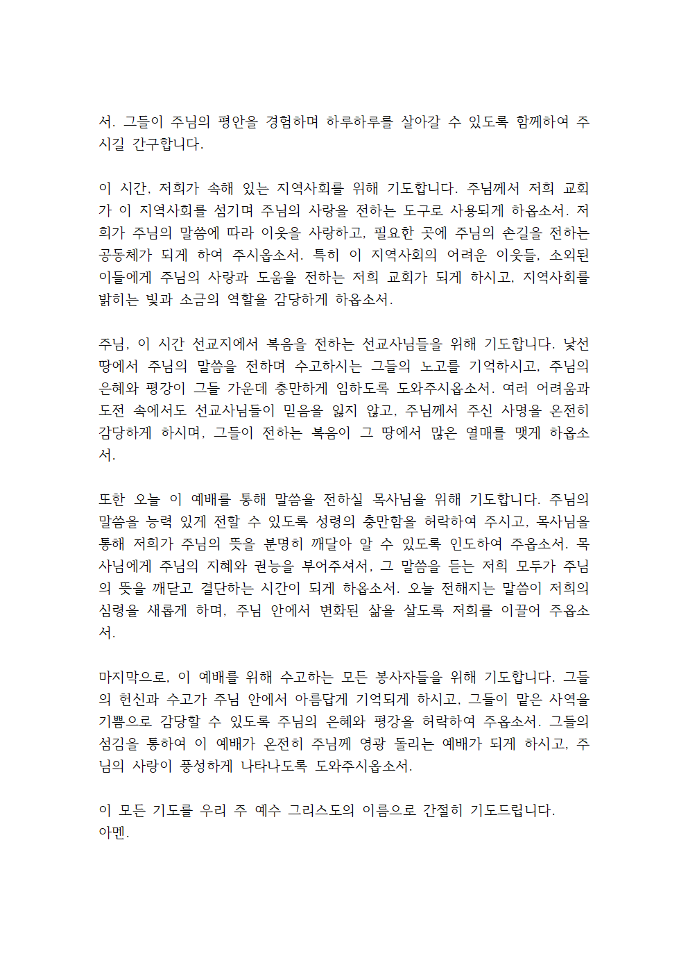 이 시간, 저희가 속해 있는 지역사회를 위해 기도합니다. 주님께서 저희 교회가 이 지역사회를 섬기며 주님의 사랑을 전하는 도구로 사용되게 하옵소서. 저희가 주님의 말씀에 따라 이웃을 사랑하고, 필요한 곳에 주님의 손길을 전하는 공동체가 되게 하여 주시옵소서. 특히 이 지역사회의 어려운 이웃들, 소외된 이들에게 주님의 사랑과 도움을 전하는 저희 교회가 되게 하시고, 지역사회를 밝히는 빛과 소금의 역할을 감당하게 하옵소서.