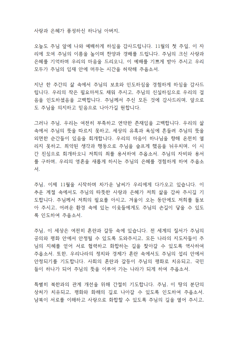 '11월 1째 주일예배 대표기도문 (첫째 주 주일낮 예배)'