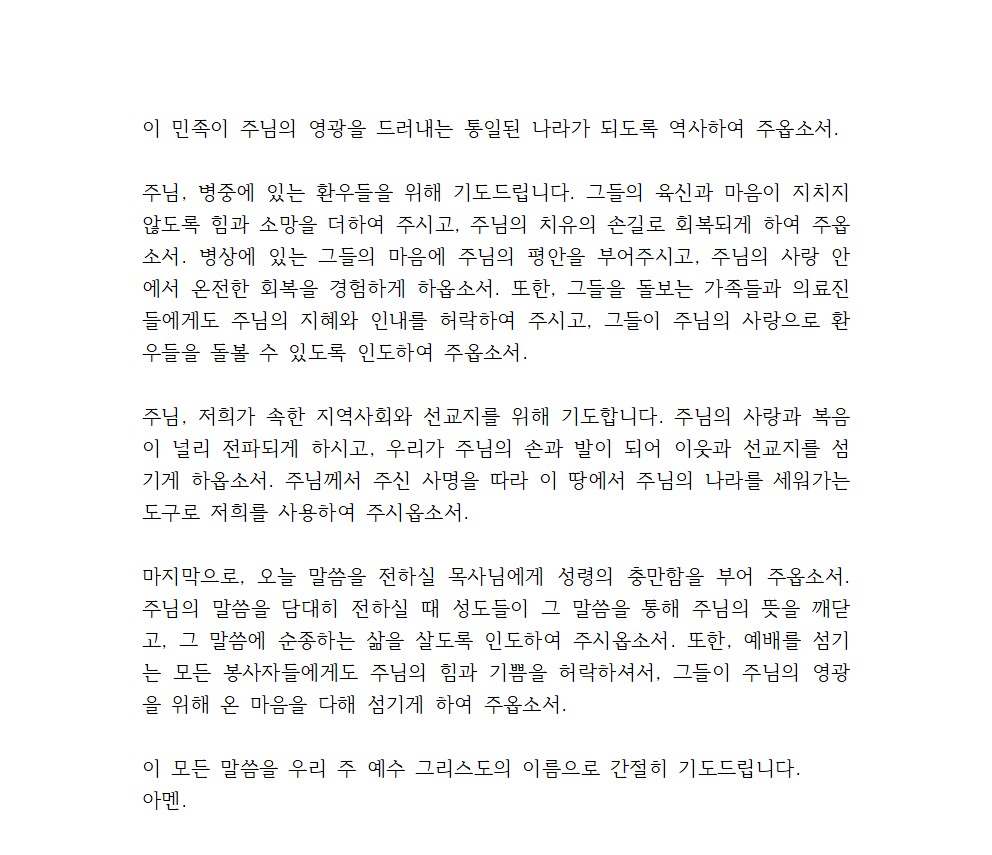 이 모든 말씀을 우리 주 예수 그리스도의 이름으로 간절히 기도드립니다. 아멘.