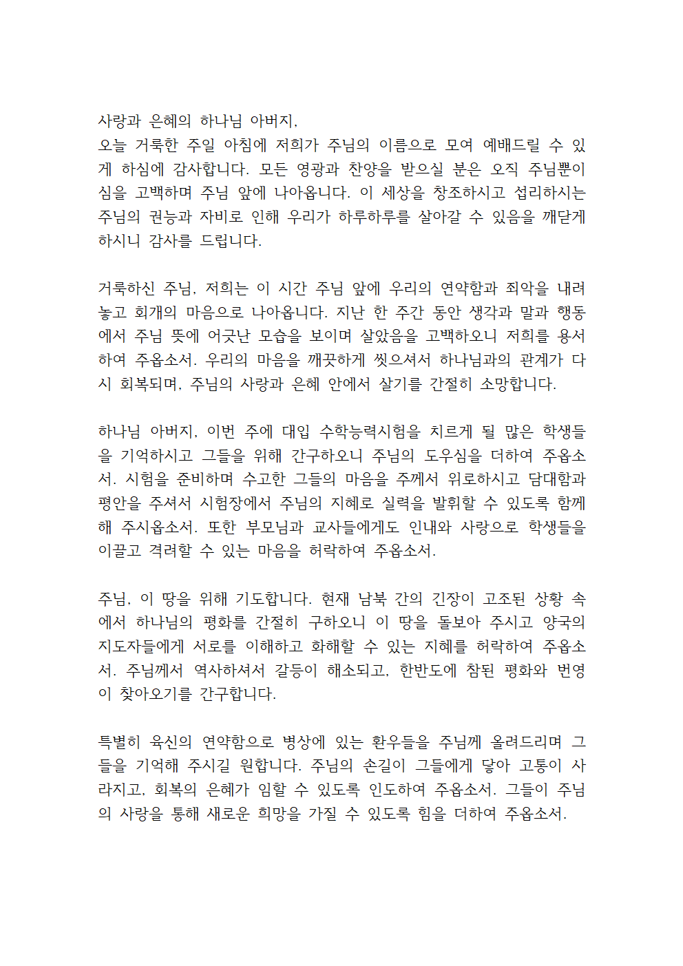 이번 기도문은 11월 둘째 주일 예배에서 찬양과 감사의 마음으로 하나님께 나아가며, 대입 수능시험을 앞둔 학생들과 남북 평화, 환우, 선교사님들, 예배 봉사자들을 위한 간구를 담고 있습니다.