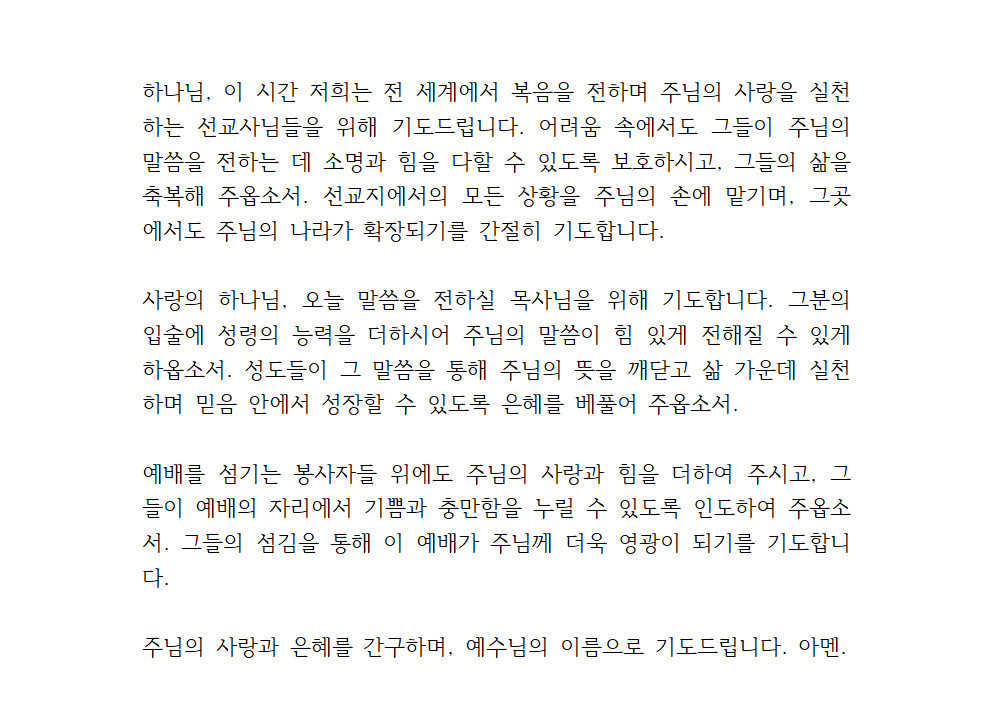 사랑의 하나님, 오늘 말씀을 전하실 목사님을 위해 기도합니다. 그분의 입술에 성령의 능력을 더하시어 주님의 말씀이 힘 있게 전해질 수 있게 하옵소서. 성도들이 그 말씀을 통해 주님의 뜻을 깨닫고 삶 가운데 실천하며 믿음 안에서 성장할 수 있도록 은혜를 베풀어 주옵소서.
