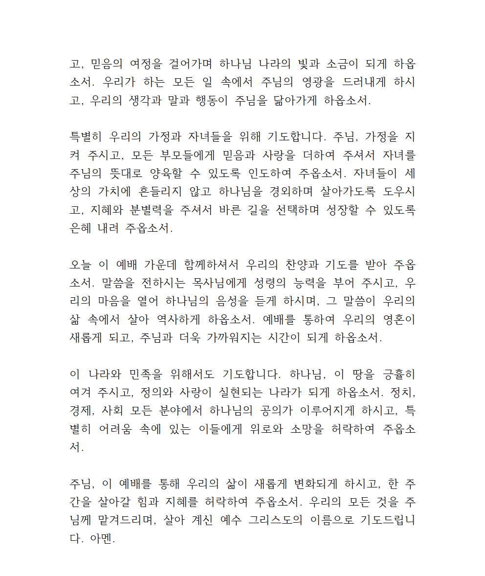 주님, 이 예배를 통해 우리의 삶이 새롭게 변화되게 하시고, 한 주간을 살아갈 힘과 지혜를 허락하여 주옵소서. 우리의 모든 것을 주님께 맡겨드리며, 살아 계신 예수 그리스도의 이름으로 기도드립니다. 아멘.