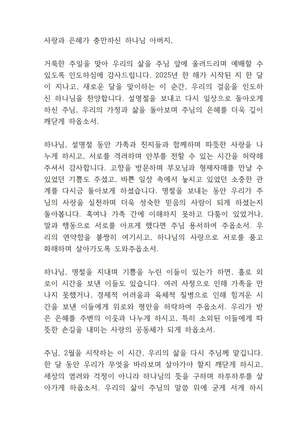 ※ 다음은 다른 형식의 2월 1째주 기도문입니다. 필요하실 때 사용해 보세요.