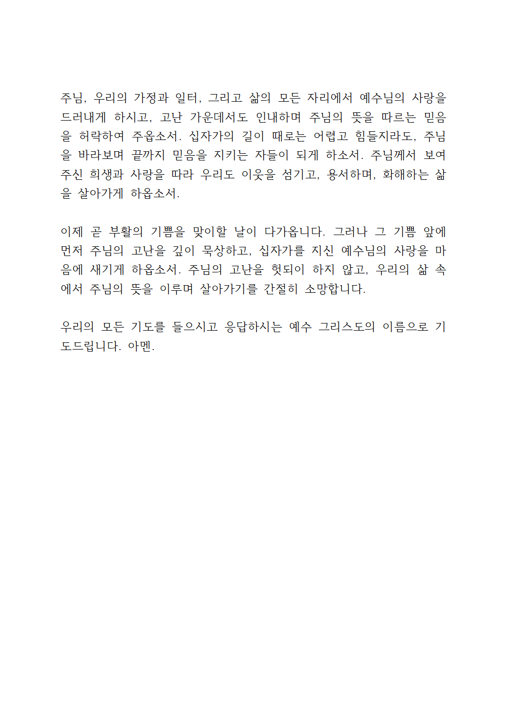 사랑의 주님, 이번 한 주간이 고난주간으로 이어지며, 주님의 십자가 길을 깊이 묵상하는 시간이 되게 하여 주옵소서. 주님의 겸손과 희생을 기억하며, 우리도 주님의 발자취를 따라가는 참된 제자로 살아가게 하시고, 세상 속에서 빛과 소금의 역할을 감당하게 하옵소서. 또한 주님의 사랑을 본받아 이웃을 돌아보고, 낮은 자리를 기꺼이 선택하며, 주님의 사랑을 실천하는 삶을 살게 하여 주시옵소서.