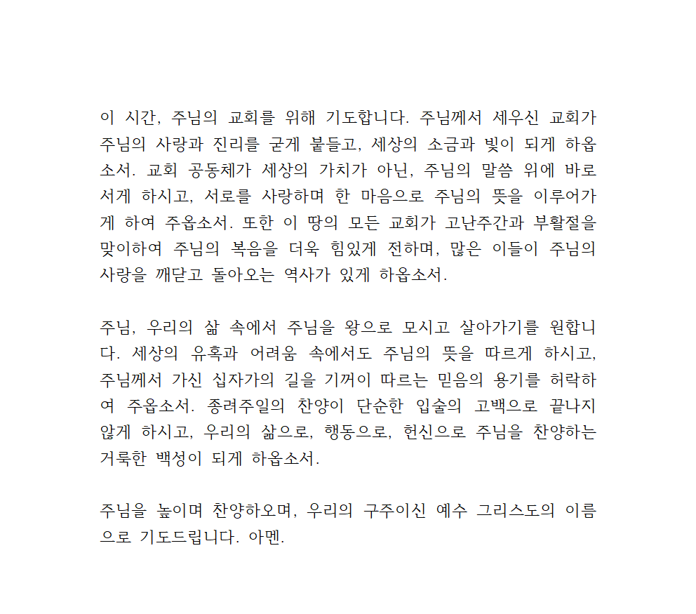이 시간, 주님의 교회를 위해 기도합니다. 주님께서 세우신 교회가 주님의 사랑과 진리를 굳게 붙들고, 세상의 소금과 빛이 되게 하옵소서. 교회 공동체가 세상의 가치가 아닌, 주님의 말씀 위에 바로 서게 하시고, 서로를 사랑하며 한 마음으로 주님의 뜻을 이루어가게 하여 주옵소서. 또한 이 땅의 모든 교회가 고난주간과 부활절을 맞이하여 주님의 복음을 더욱 힘있게 전하며, 많은 이들이 주님의 사랑을 깨닫고 돌아오는 역사가 있게 하옵소서.
