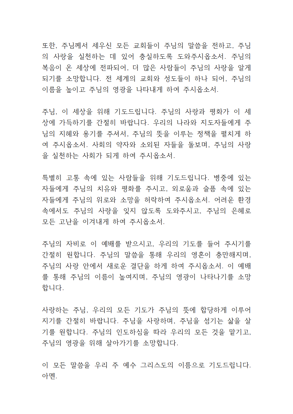 또한, 주님께서 세우신 모든 교회들이 주님의 말씀을 전하고, 주님의 사랑을 실천하는 데 있어 충실하도록 도와주시옵소서. 주님의 복음이 온 세상에 전파되어, 더 많은 사람들이 주님의 사랑을 알게 되기를 소망합니다. 전 세계의 교회와 성도들이 하나 되어, 주님의 이름을 높이고 주님의 영광을 나타내게 하여 주시옵소서.