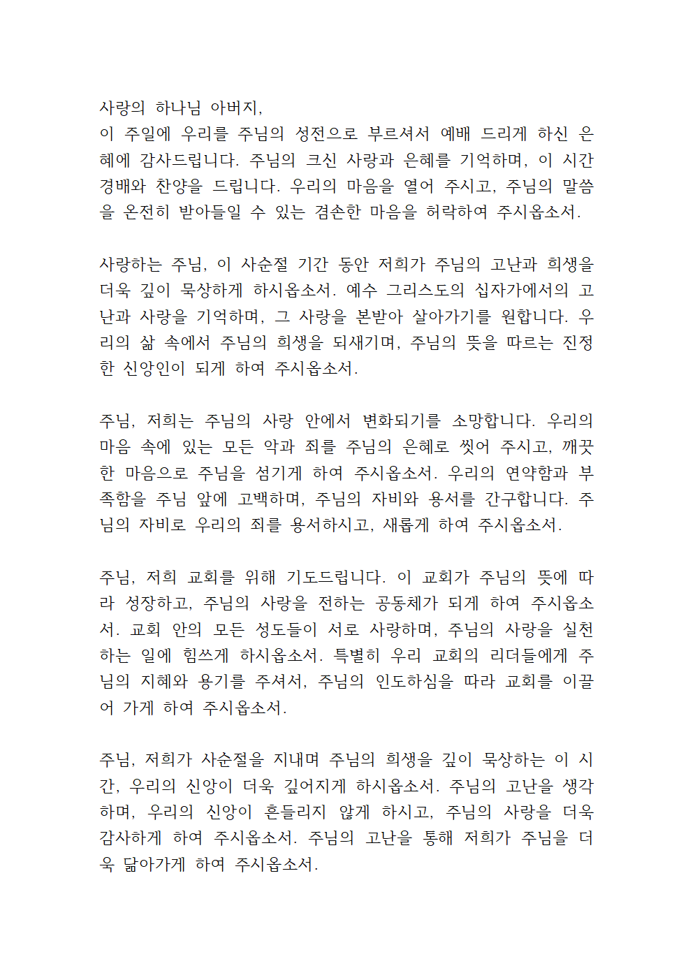 주님, 저희가 사순절을 지내며 주님의 희생을 깊이 묵상하는 이 시간, 우리의 신앙이 더욱 깊어지게 하시옵소서. 주님의 고난을 생각하며, 우리의 신앙이 흔들리지 않게 하시고, 주님의 사랑을 더욱 감사하게 하여 주시옵소서. 주님의 고난을 통해 저희가 주님을 더욱 닮아가게 하여 주시옵소서.