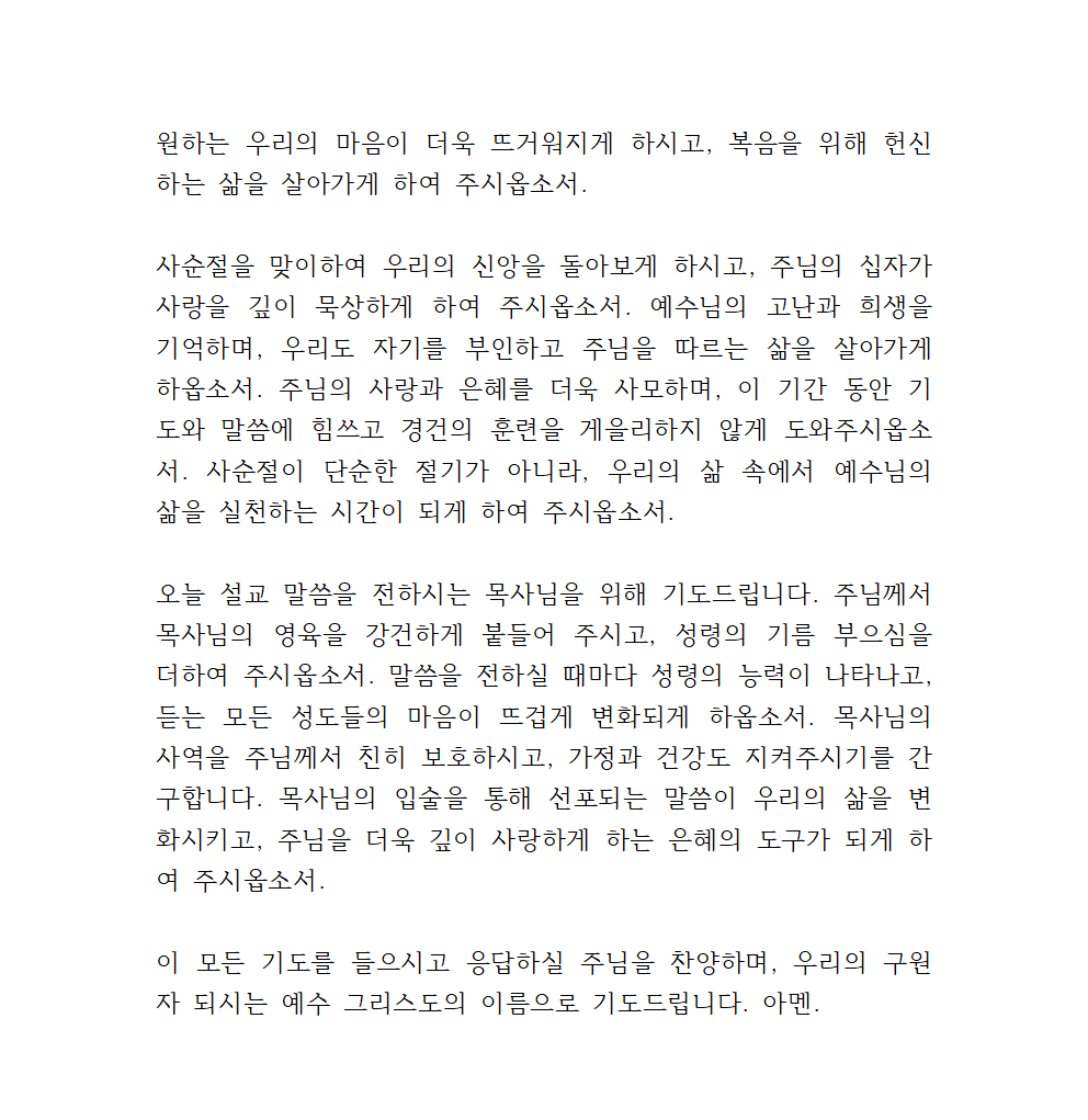 사순절을 맞이하여 우리의 신앙을 돌아보게 하시고, 주님의 십자가 사랑을 깊이 묵상하게 하여 주시옵소서. 예수님의 고난과 희생을 기억하며, 우리도 자기를 부인하고 주님을 따르는 삶을 살아가게 하옵소서. 주님의 사랑과 은혜를 더욱 사모하며, 이 기간 동안 기도와 말씀에 힘쓰고 경건의 훈련을 게을리하지 않게 도와주시옵소서. 사순절이 단순한 절기가 아니라, 우리의 삶 속에서 예수님의 삶을 실천하는 시간이 되게 하여 주시옵소서.