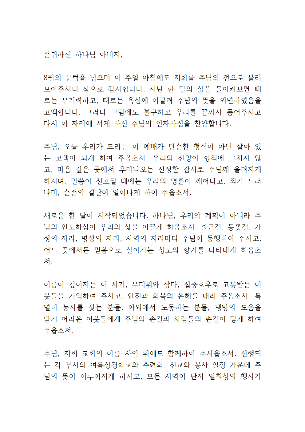 8월 첫주일 대표기도 시 아래의 기도문들을 참고해서 함께 기도해 보세요~!!