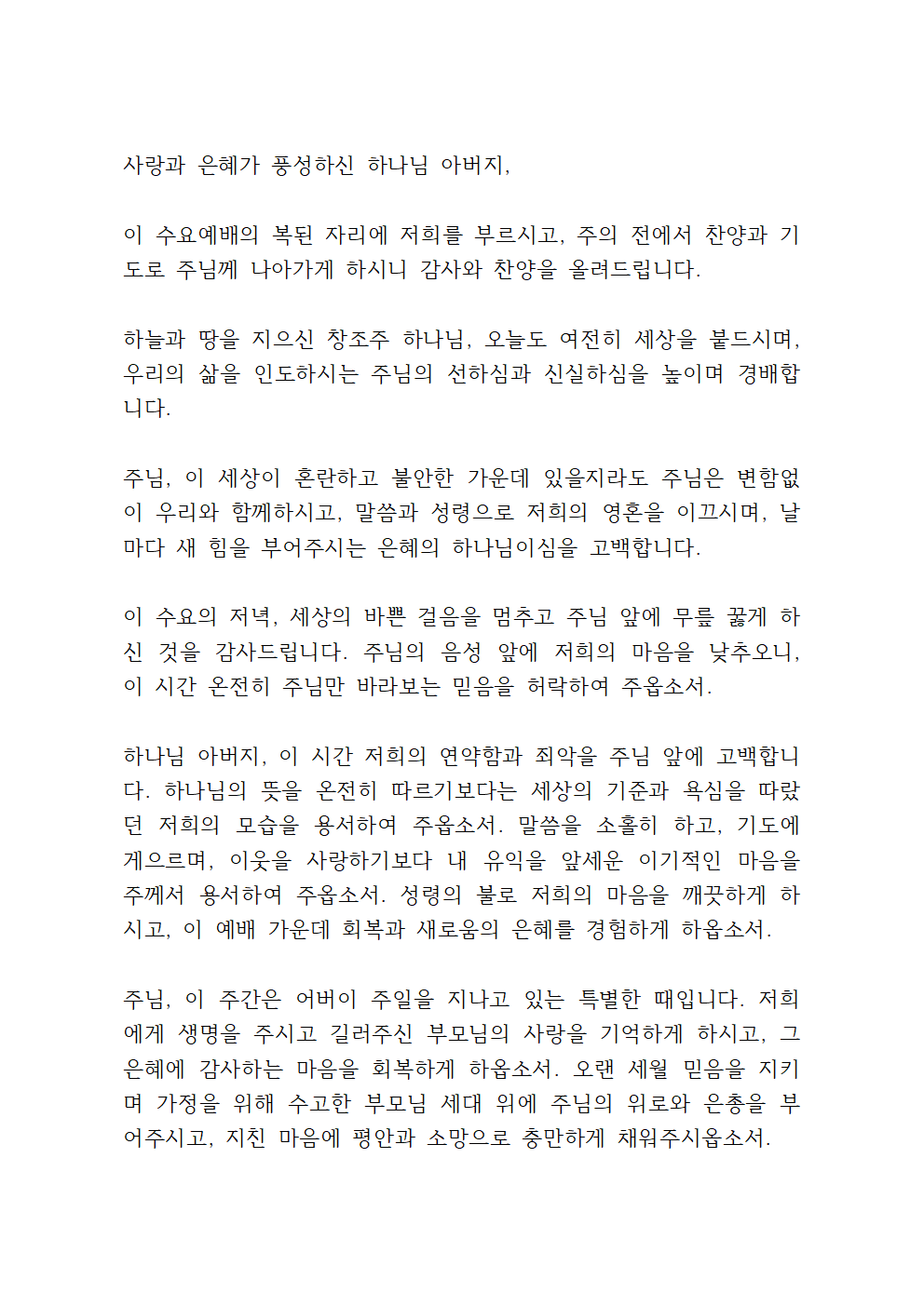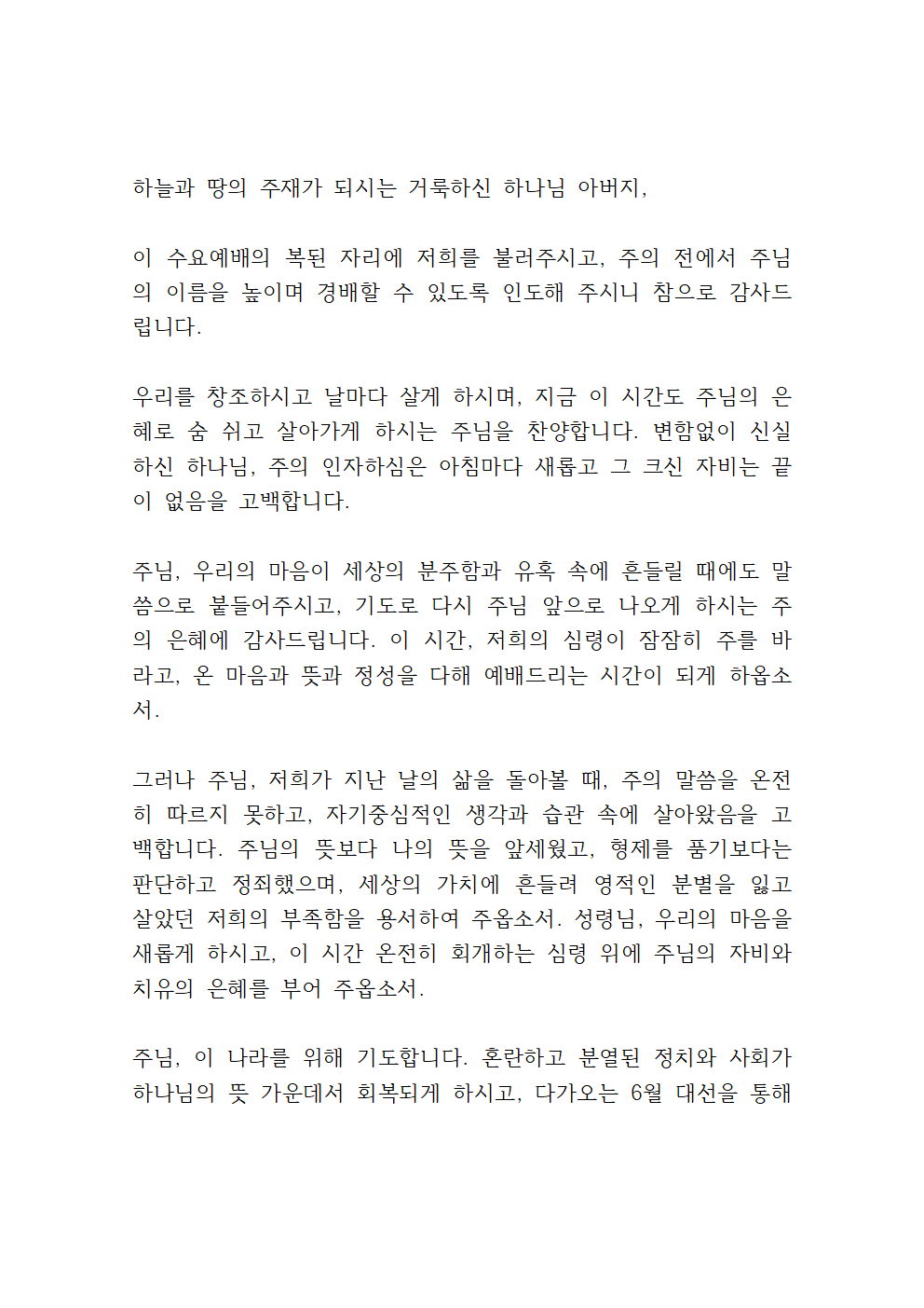 5월 첫째 주 수요예배 대표기도문