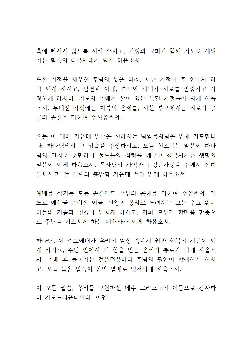 사랑의 하나님, 오늘 이 수요예배 가운데 말씀을 전하시는 목사님을 위해 기도드립니다. 하나님께서 그 입술을 주장하시고, 선포되는 말씀마다 하늘의 권세와 능력이 임하게 하시며, 그 말씀이 우리의 심령을 두드리고 변화시키는 생명의 말씀이 되게 하옵소서. 목사님의 사역과 가정 위에 늘 성령의 충만함을 더하시고, 육신의 건강도 주께서 지켜 주시며, 지치지 않고 항상 주의 능력으로 감당하는 종이 되게 하옵소서.