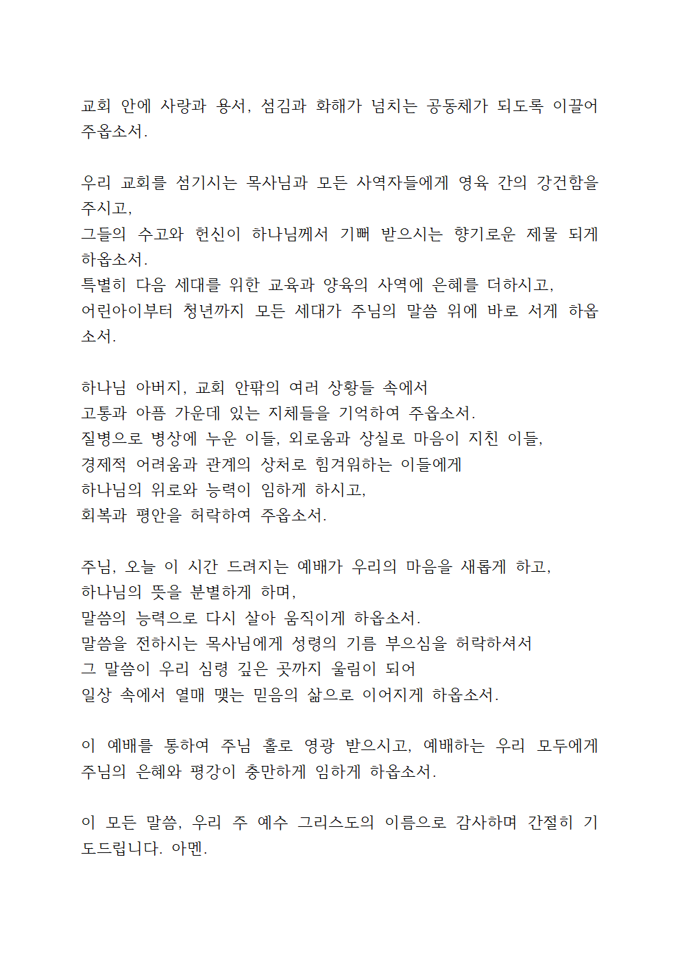 주님, 오늘도 주님의 몸 된 교회를 위하여 간구합니다. 저희 교회가 이 시대 속에서 복음의 본을 보이는 공동체가 되게 하시고, 믿음의 뿌리를 깊이 내리고 세상을 향해 빛과 소금의 사명을 감당하게 하옵소서. 말씀과 기도에 힘쓰는 성도들이 되게 하시고, 교회 안에 사랑과 용서, 섬김과 화해가 넘치는 공동체가 되도록 이끌어 주옵소서.