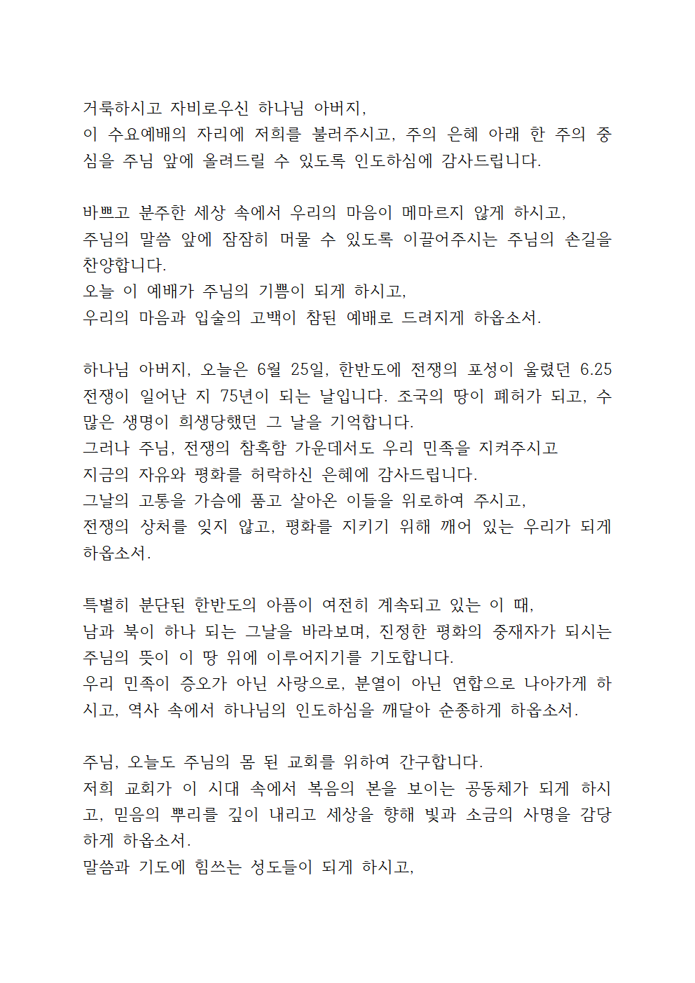 '2025년 6월 넷째주일 대표기도문' 이번 글에서는 2025년 6월 넷째 주일 대표기도문을 안내해 드리겠습니다. 6월 넷째 주는 75년 전에 6.25 전쟁이 있었던 주간이기 때문에이 주간 기도에서는 특히 우