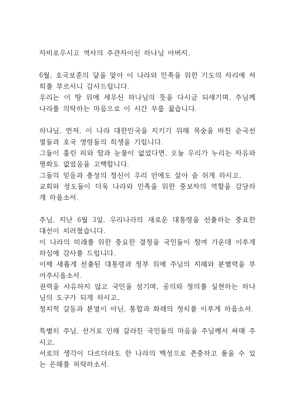 주님, 여전히 이 땅에는 아픔과 혼란이 가득합니다. 6.25 전쟁의 기억을 품고 있는 이 계절에, 우리 민족에게 자비를 베풀어주시고 더 이상 전쟁과 갈등이 반복되지 않도록 평화의 길을 허락하여 주옵소서. 북녘 땅에도 주님의 복음의 빛이 임하게 하시고, 정의와 공의가 이 땅 가운데 뿌리내리게 하셔서 우리 대한민국이 하나님 나라의 가치 위에 굳게 세워지게 하옵소서.