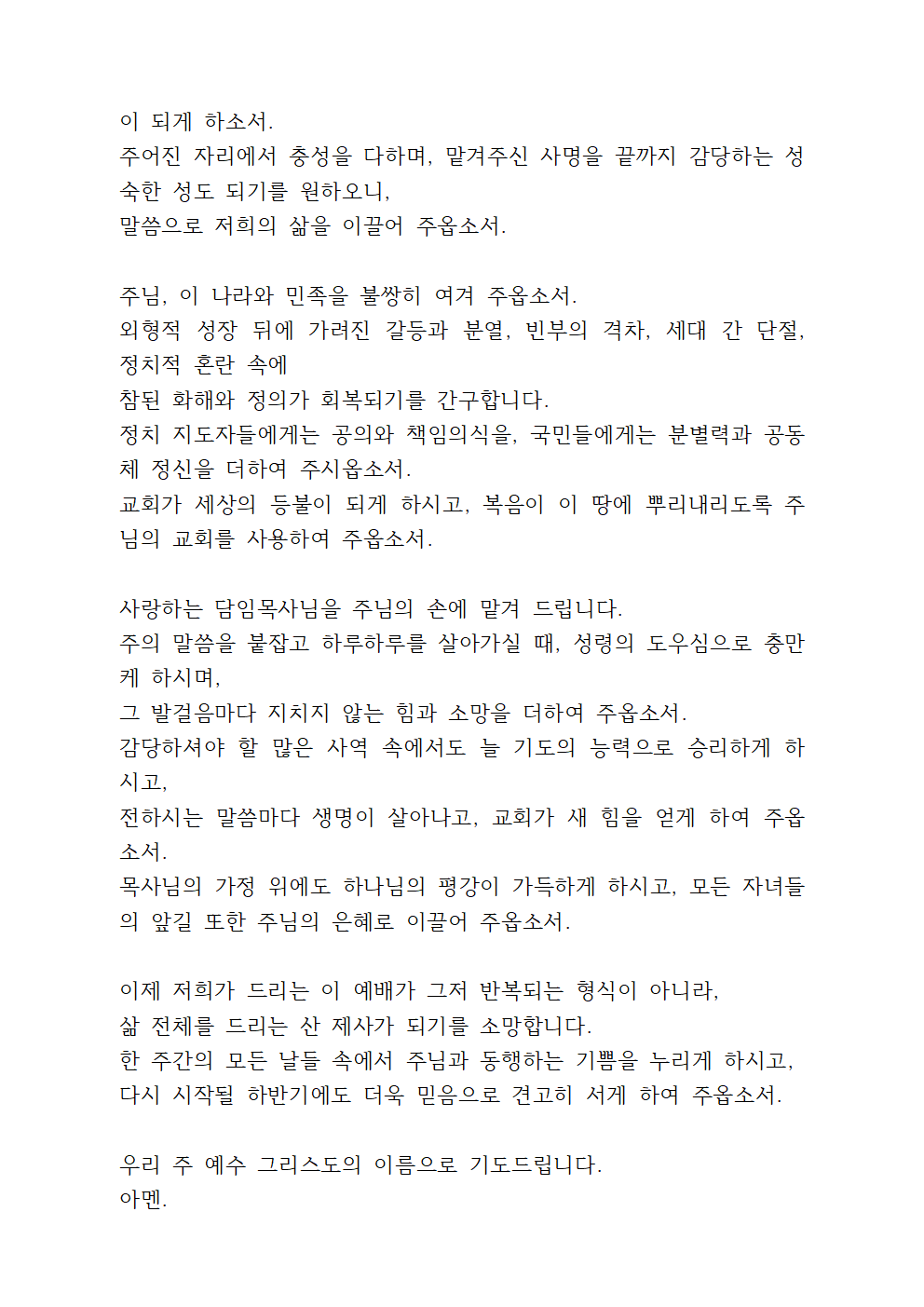 특별히 오늘 말씀을 전하시는 담임목사님을 위해 기도드립니다. 말씀 가운데 성령의 기름 부으심이 넘치게 하시고, 그 입술을 통하여 살아 있는 하나님의 음성이 선포되게 하옵소서. 목사님의 영육을 날마다 강건하게 붙드시고, 그 가정에도 주님의 은혜와 평강이 충만하게 머물게 하소서. 하나님께서 세우신 종의 길 위에 언제나 신실한 동행이 있도록 인도하여 주옵소서.