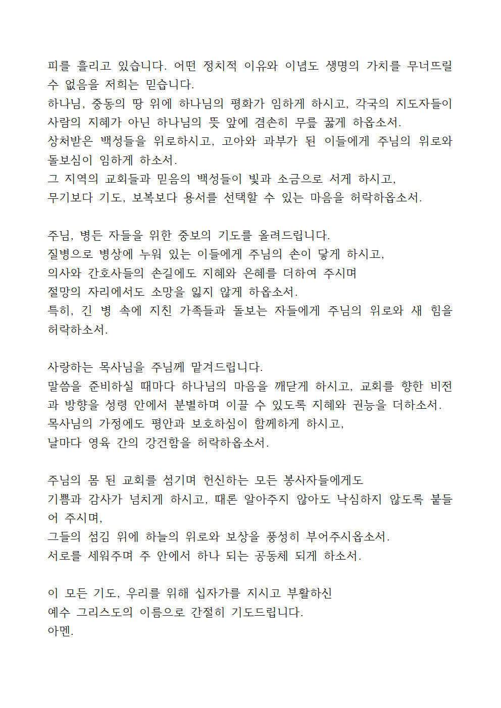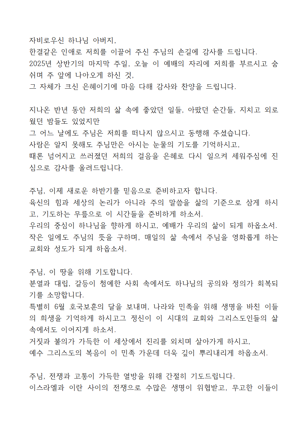 또한, 최근 국제 정세 속 이스라엘과 이란 간의 전쟁 상황을 위해 기도하고, 이 땅과 열방 가운데 하나님의 평화와 정의가 임하기를 간절히 간구하는 기도라면 더욱 좋을 듯합니다.