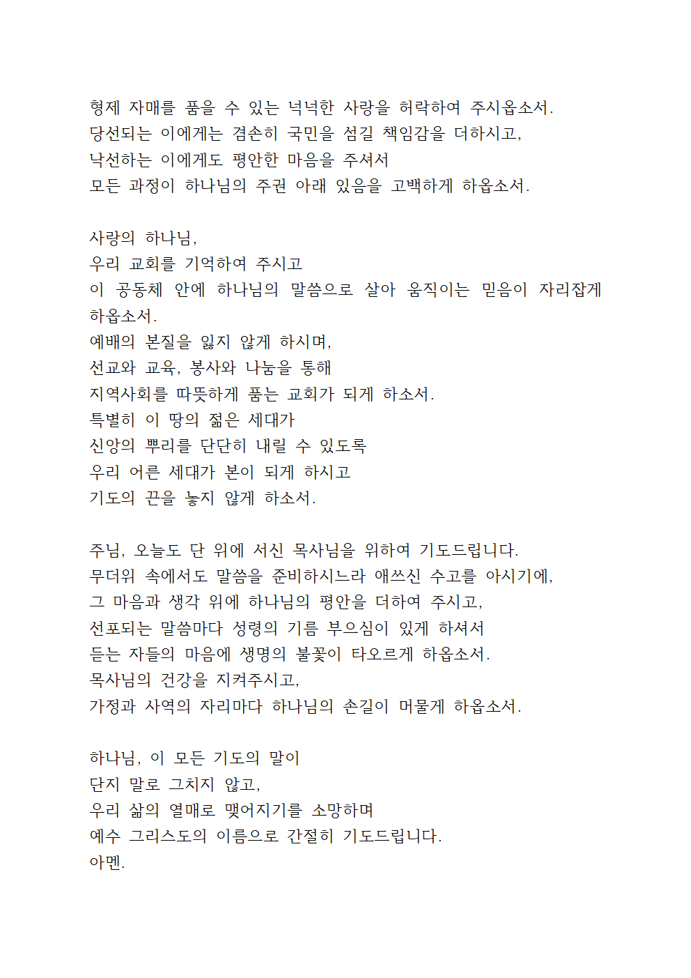 또한 선거를 둘러싼 분열과 갈등이 교회 안에도 스며들지 않게 하시고, 서로 다른 생각과 입장 속에서도 형제자매를 품을 수 있는 넉넉한 사랑을 허락하여 주시옵소서. 당선되는 이에게는 겸손히 국민을 섬길 책임감을 더하시고, 낙선하는 이에게도 평안한 마음을 주셔서 모든 과정이 하나님의 주권 아래 있음을 고백하게 하옵소서.