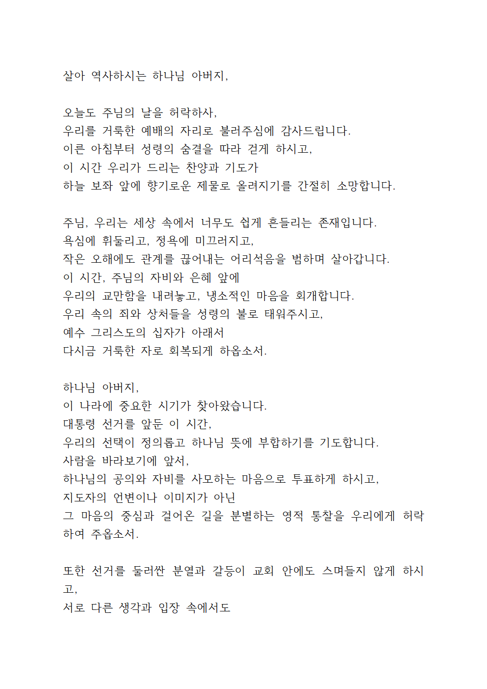 하나님 아버지, 이 나라에 중요한 시기가 찾아왔습니다. 대통령 선거를 앞둔 이 시간, 우리의 선택이 정의롭고 하나님 뜻에 부합하기를 기도합니다. 사람을 바라보기에 앞서, 하나님의 공의와 자비를 사모하는 마음으로 투표하게 하시고, 지도자의 언변이나 이미지가 아닌 그 마음의 중심과 걸어온 길을 분별하는 영적 통찰을 우리에게 허락하여 주옵소서.