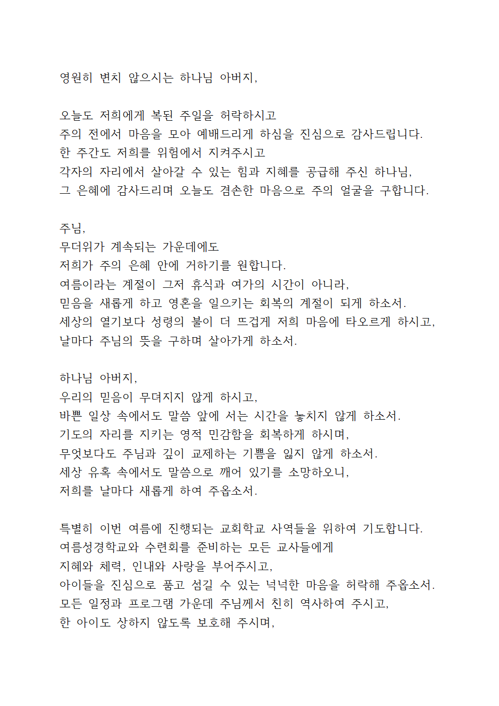 이번 기도를 통해 7월의 무더위 속에서도 주님의 은혜를 더욱 사모하며 신앙의 초심을 되새기면 좋겠습니다.