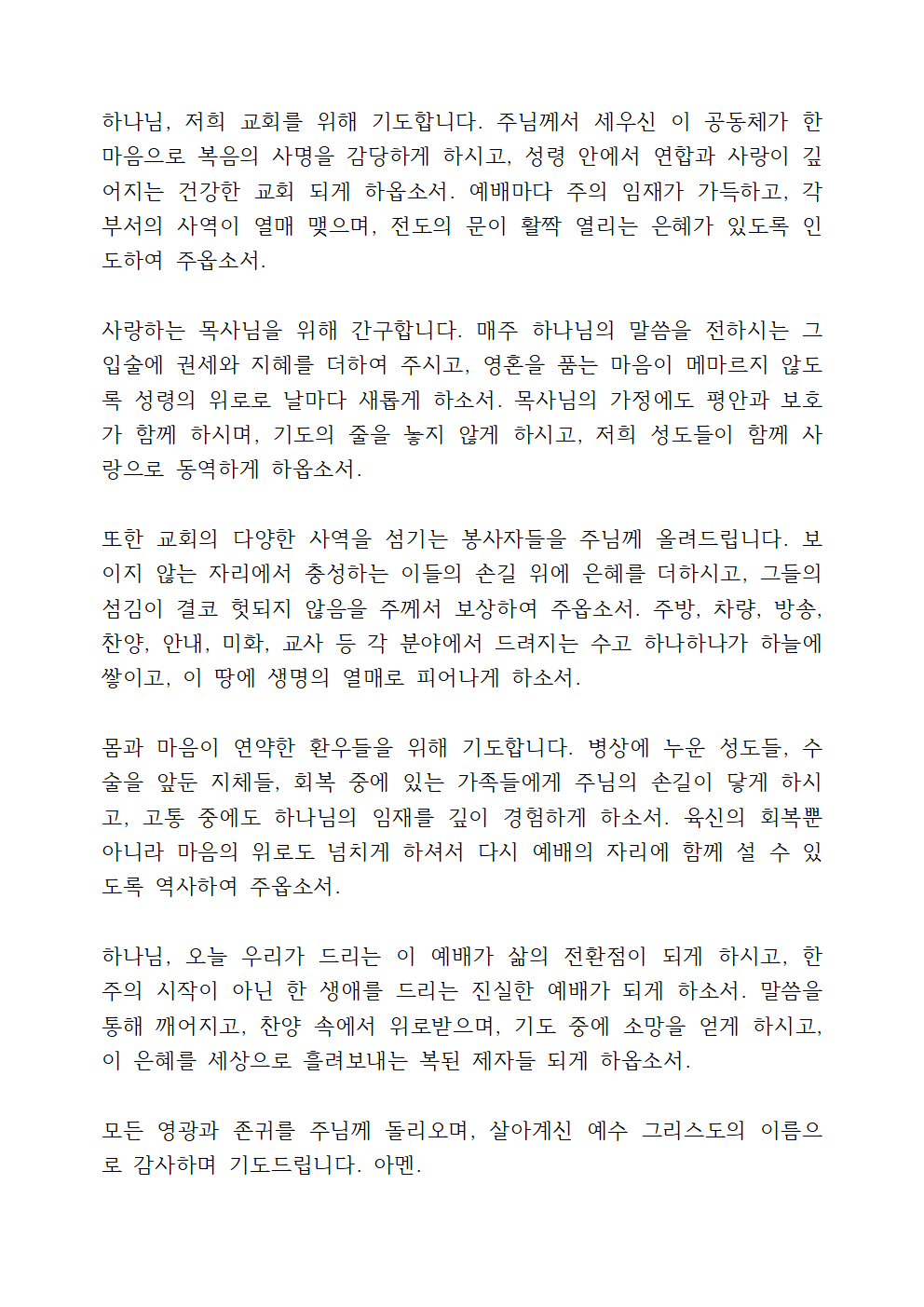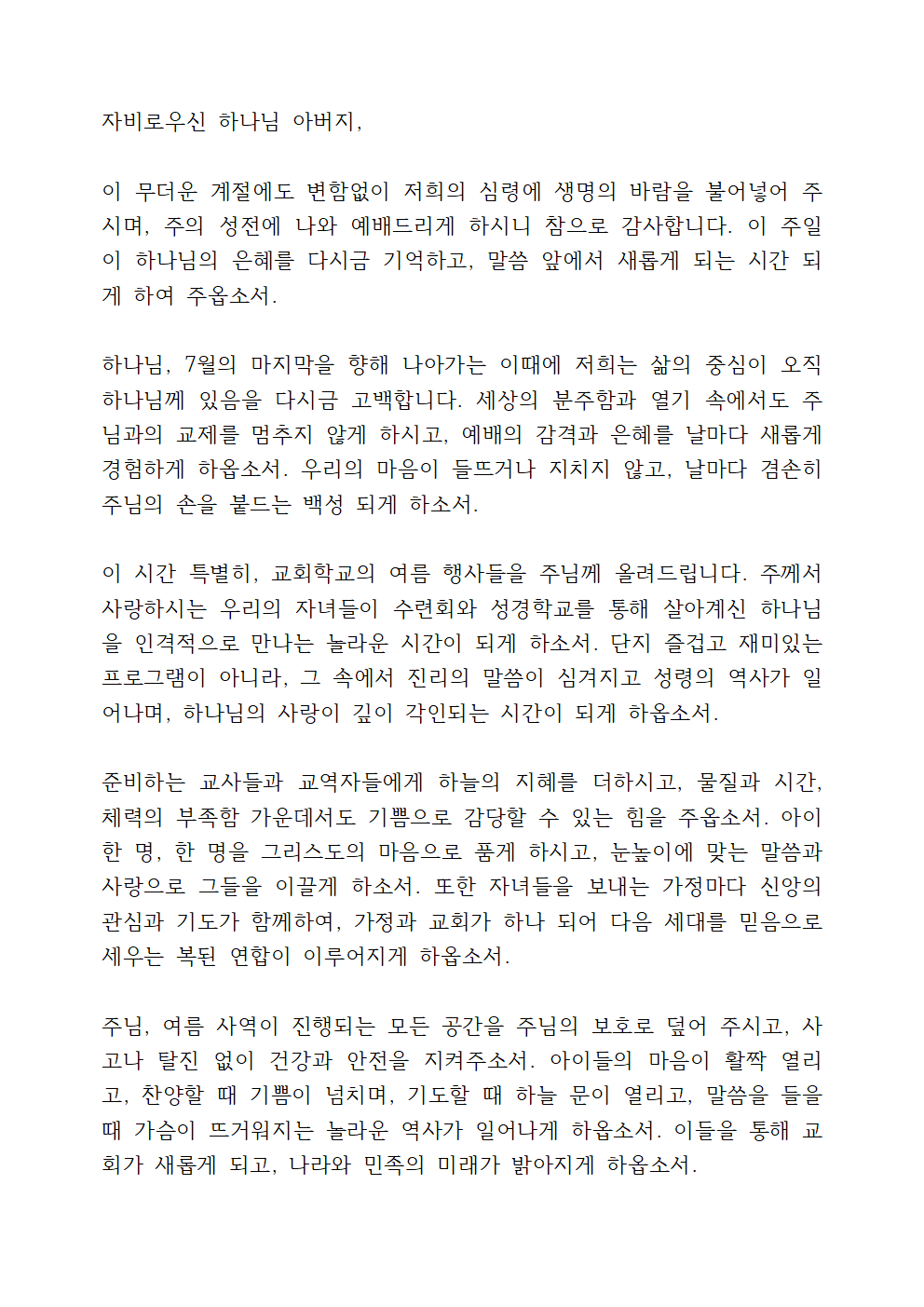마지막으로, 이 예배를 통해 받은 은혜가 예배당 문을 나서며 사라지지 않게 하시고 삶의 현장에서 다시 예배자로 살아가는 우리 모두가 되게 하옵소서. 오늘 하루, 이번 한 주, 이 7월 한 달이 하나님을 기쁘시게 하는 믿음의 시간으로 채워지기를 간절히 소망하며