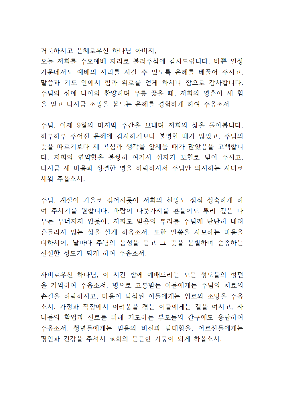 이번 글에서는 9월 넷째주 대표기도문을 안내해 드리겠습니다.