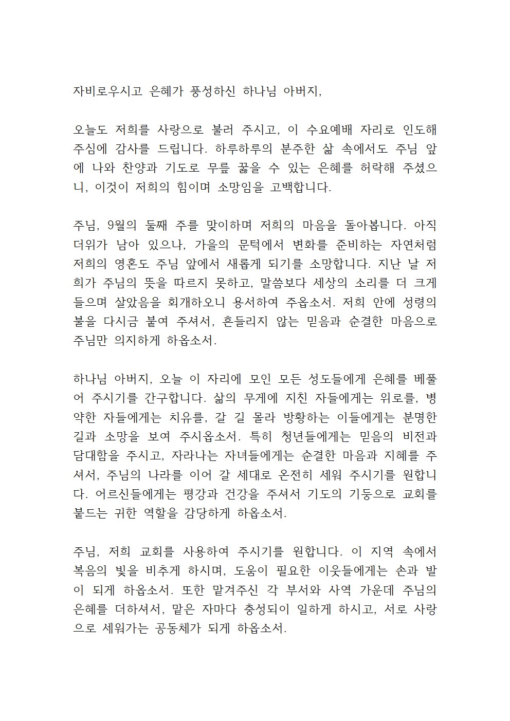 9월 둘째주 수요예배 대표기도문